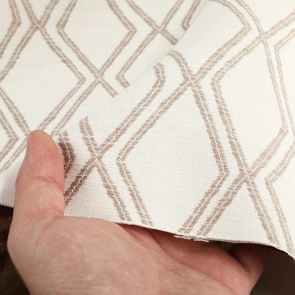 Sunbrella® Voyage Dune is a 100% acrylic performance fabric. It features a geometric pattern of stone-outlined diamonds on a white background that brings subtle sophistication to whatever project it’s used for.